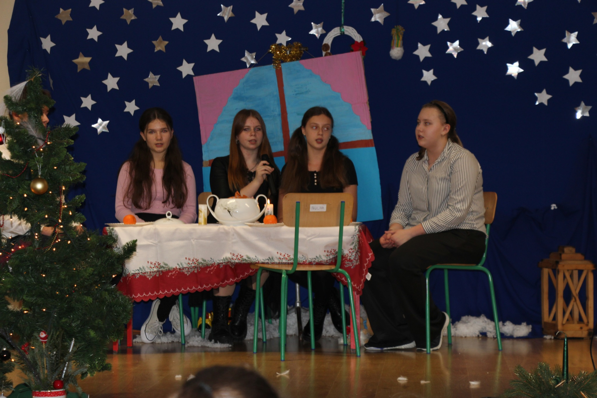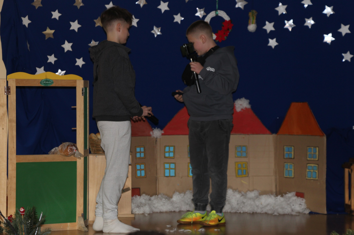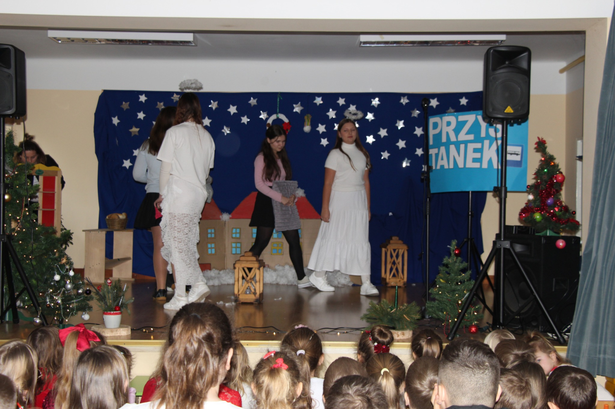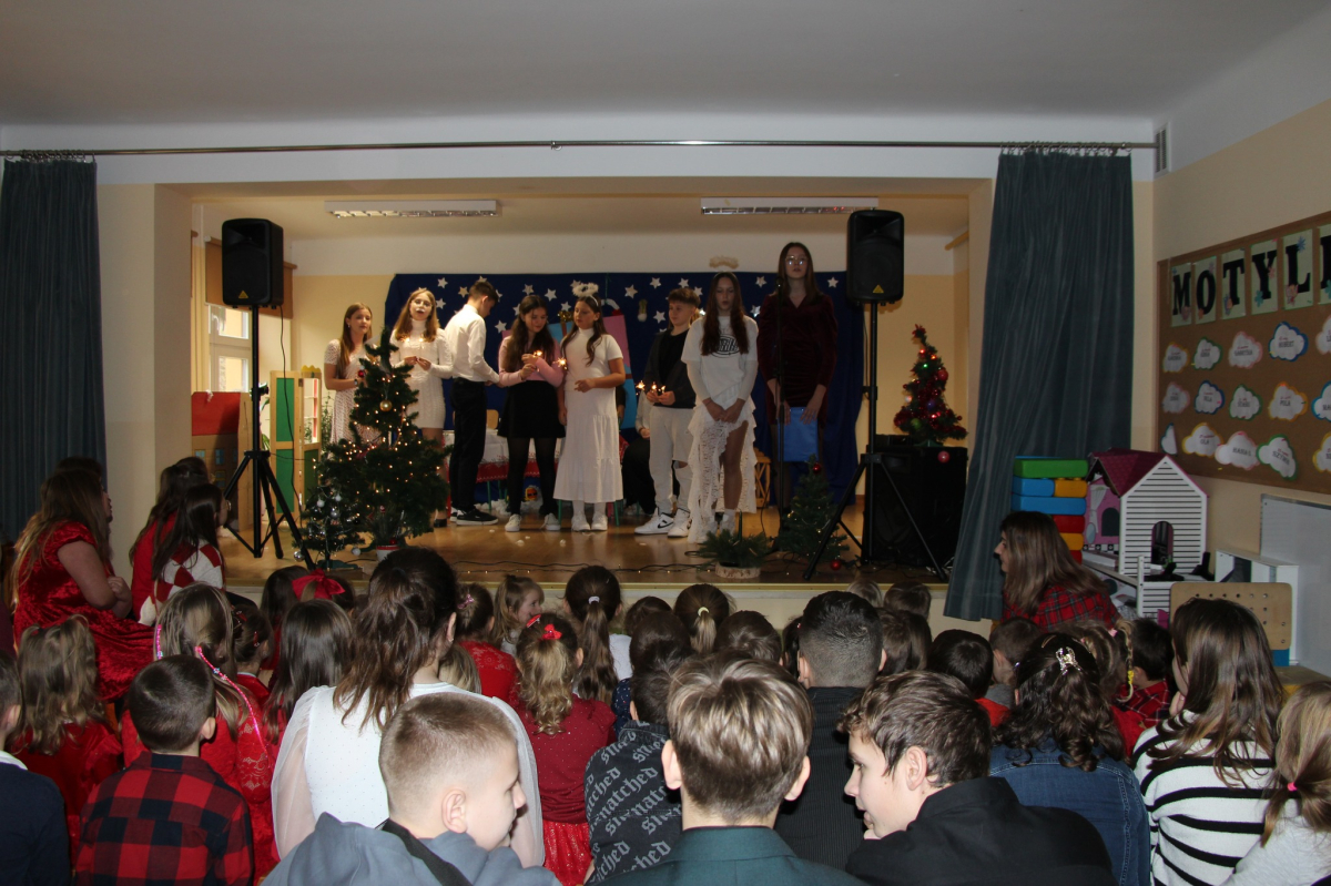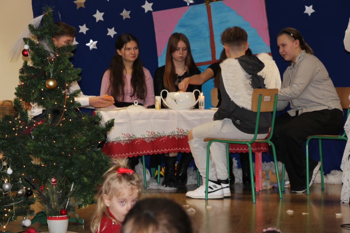 Jasełka to widowisko o Bożym Narodzeniu, które od wieków wpisane jest w polską tradycję. Tegoroczne jasełka zostały przygotowane przez uczniów klas VI, VII i VIII. Sala wypełniła się magiczną atmosferą – dekoracje oraz oczekiwanie widowni sprawiły, że od pierwszych chwil poczuliśmy prawdziwego ducha Świąt. Piękne przedstawienie przypomniało, że święta Bożego Narodzenia to czas radości, wspólnoty i pięknych tradycji . Dzięki młodym aktorom magia tych chwil stała się namacalna dla każdego, kto uczestniczył w tym wydarzeniu. Po jasełkach Pani Dyrektor złożyła wszystkim świąteczne życzenia.